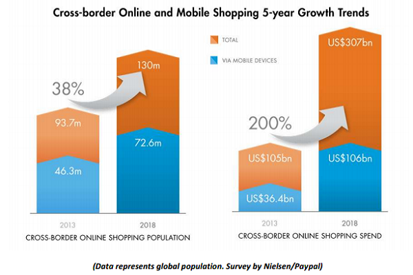 Based on the survey data by Nielsen/Paypal, the online shopping's market has growth so fast from 2013 - 2018. The population has growth around 38% and the spend has growth around 200%.